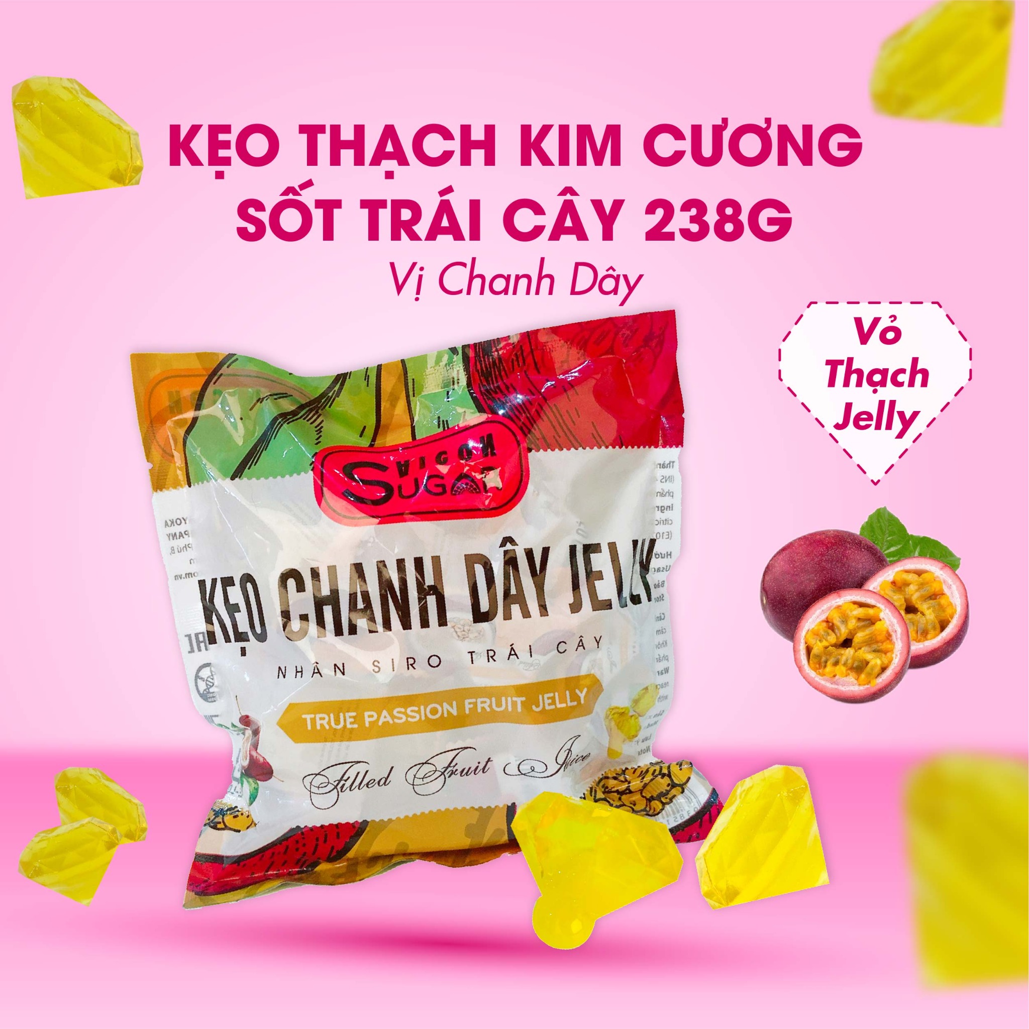 Kẹo kim cương sốt trái cây vị Chanh dây là một món quà vặt được cả trẻ em lẫn người lớn yêu thích, hương vị chua chua ngọt ngọt và thơm vị Chanh dây rất ngon và vui miệng.