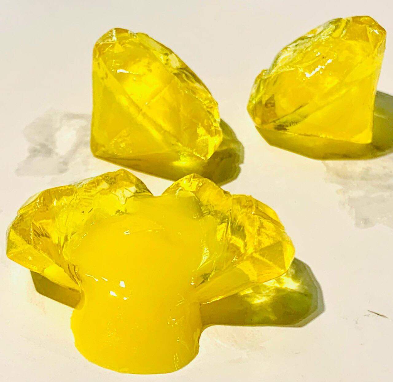 Kẹo dẻo có hình kim cương đẹp mắt, bên ngoài mềm mịn cắn vào sẽ có một lớp nhân sốt Chanh dây tan chảy thơm ngon. Sốt Chanh dây được làm hoàn toàn 100% từ trái cây thật, đảm bảo an toàn và vị ngon tuyệt vời.