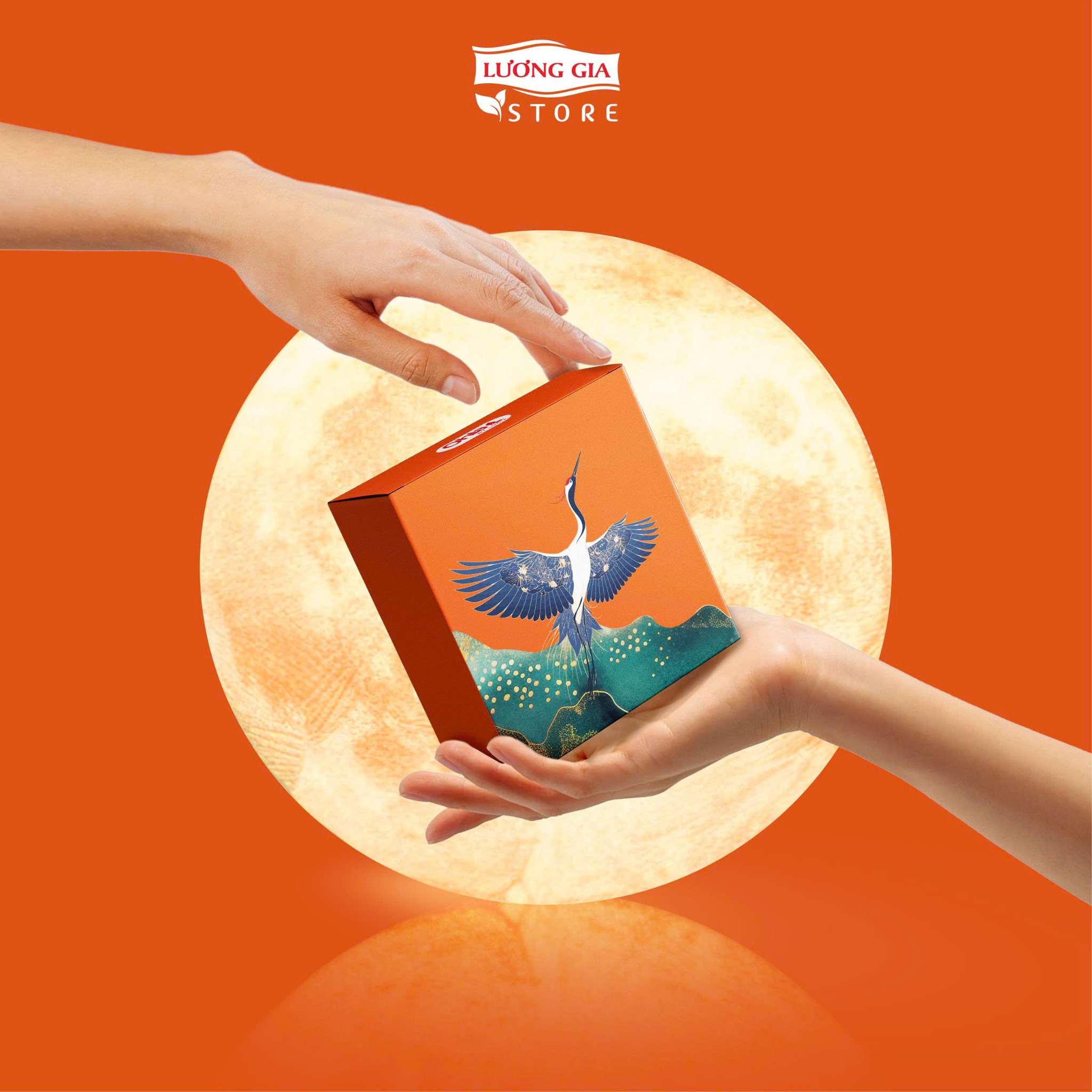 Thiết kế hộp dựa trên tinh thần ấy, kết hợp sắc màu xanh – cam trẻ trung cùng hình ảnh hạc xuân mạnh mẽ vươn mình, gửi gắm lời chúc may mắn – an khang – thịnh vượng cho năm mới. Hiệu ứng phối cảnh trăng sáng, núi non và bầu trời xuân tạo nên một tổng thể sang trọng, tinh tế và đầy chất nghệ thuật.